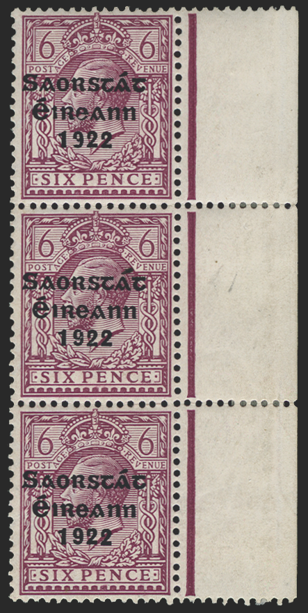 £675.00| /Ireland 1922-23 6d reddish purple, type 5 overprint by Thom, right marginal vertical strip of 3, the centre stamp variety 'Accent inserted by hand'...