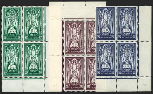 £1,250.00| /Ireland 1937 "St Patrick" set of 3 (2s6d emerald-green, 5 shilling maroon, 10 shilling deep blue), watermark 10, SG102/4. Unusually well-centred up...