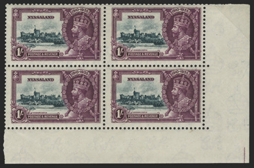 £550.00| /Nyasaland 1935 Silver Jubilee 1s slate and purple, lower right corner block of 4 from vignette plate "2A", showing variety "Kite and vertical log" ...