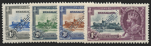 £120.00| /Nyasaland 1935 Silver Jubilee complete set of 4 to 1s, perforated 'SPECIMEN' (type W8), SG123s/6s. A brilliant mint set with original gum. The 2d s...