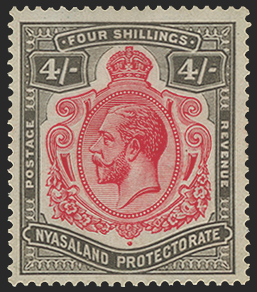 £225.00| /Nyasaland 1921-33 4s carmine and black, Script watermark, variety 'Damaged leaf at bottom right' (R5/6), SG111f. A very fine and fresh mint example...