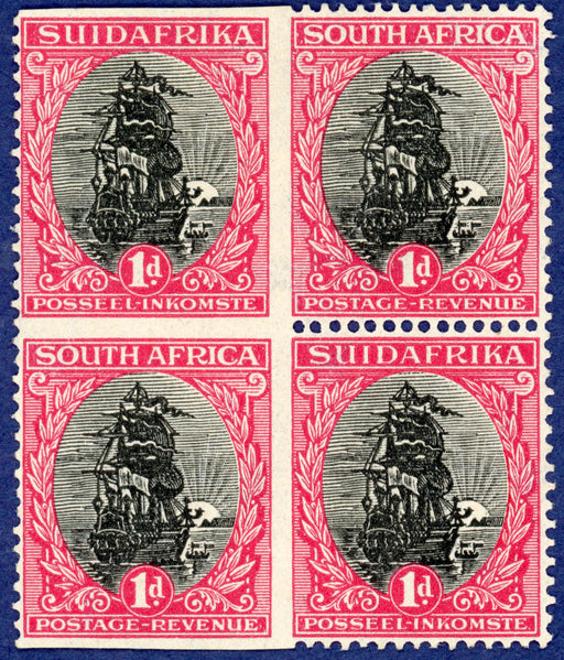 £695.00| /£695.00 South Africa 1926-27 1d black and carmine, Pretoria typo printing, block of 4, the left vertical pair ERROR IMPERFORATE THREE SIDES, SG31...