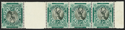 £950.00| /South Africa 1930-45 ½d black and green 'SUIDAFRIKA', rotogravure printing, inter-pane horizontal strip of 4 from right of sheet, including a tete-...