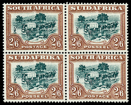 £120.00| /South Africa 1930-45 2s6d green and brown, "Ox-wagon Inspanned", Rotogravure printing, "SUIDAFRIKA" one word, upright watermark, left marginal hori...