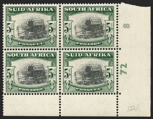 £140.00| /South Africa 1947-54 5s black and deep yellow-green 'Ox-wagon Outspanned', 'SUID-AFRIKA' hyphenated, screened printing, lower right corner block of...