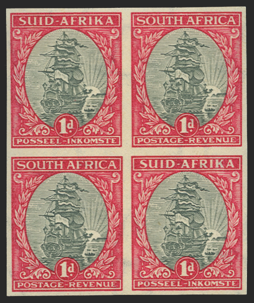 £350.00| /South Africa 1933-48 1d grey and carmine "SUID-AFRIKA" hyphenated, imperforate block of 4, SG56a. A very fine unmounted mint block of four with ful...