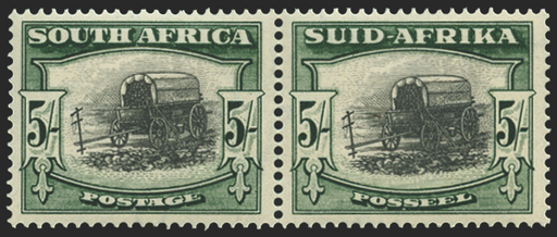 £50.00| /South Africa 1947-54 5s black and deep yellow-green, "Ox-wagon Outspanned", "SUID-AFRIKA" hyphenated, screened printing, horizontal pair, SG122b. A...