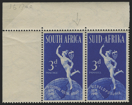 £55.00| /South Africa 1949 75th Anniversary of the Universal Postal Union 3d bright blue, upper left corner horizontal pair, left stamp (R1/1) showing varie...