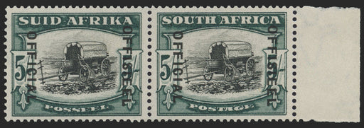 £120.00| /South Africa 1935-49 5s black and blue-green 'Ox-wagon Inspanned', type O3 overprint (with 'OFFICIAL' at left), right marginal horizontal pair, SGO...