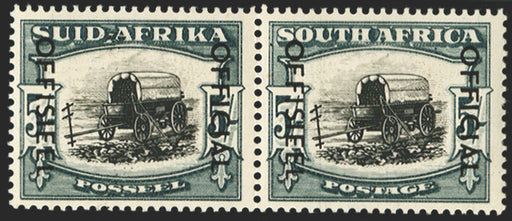 £180.00| /South Africa 1950-54 5s black and blue-green "Ox-wagon outspanned" Official, type O7 overprint on SG64a (unscreened rotogravure), horizontal pair, ...