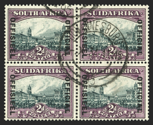 £250.00| /South Africa 1930-47 2d slate-grey and lilac Official, 'SUIDAFRIKA' one word, type O2 overprint, WATERMARK INVERTED, block of 4 with neat Johannesb...