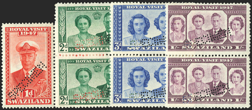 £325.00| /Swaziland 1947 Royal Visit set of 4 to 1s, perforated 'SPECIMEN' (type W9), SG42/5s. A brilliant quality mint set with original gum. The 1s has a f...