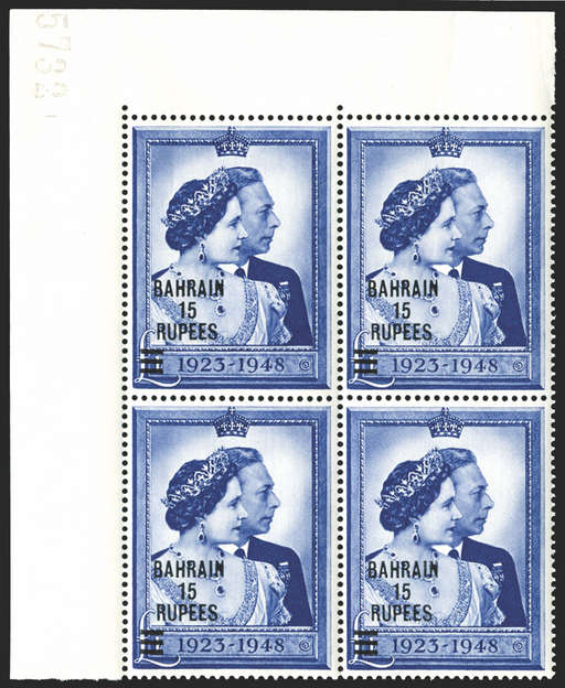 £140.00| /Bahrain 1948 Royal Silver Wedding 15r on £1 blue, upper left corner block of 4 showing '5732' sheet number, SG62. Pristine unmounted mint with full...