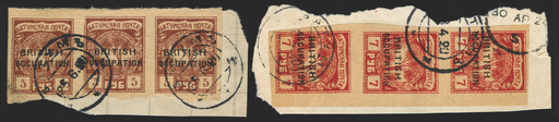 £75.00| /Batum British Occupation 1919 (10 Nov) 'BRITISH OCCUPATION' 5r brown and 7r brownish red, (SG17/18), respectively in horizontal and vertical strips...