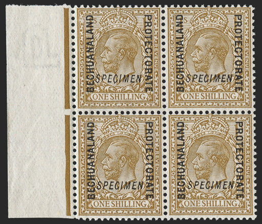 £550.00| /Bechuanaland 1913-24 1s bistre, watermark Simple Cypher, overprinted 'SPECIMEN' (type GB23), left marginal block of 4, SG82s. A very fine and fresh...