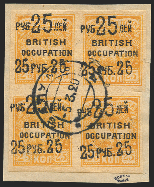 £150.00| /Batum British Occupation 1920 (1 Apr) 25r on 25k orange-yellow, type 7 surcharge in black, block of four on piece, centrally cancelled by '5 3.20' ...