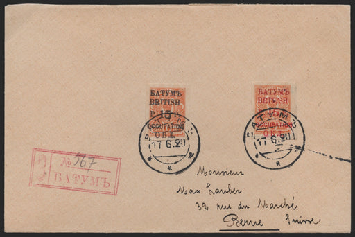 £450.00| /Batum British Occupation 1920 (17 June) registered "Lauber" cover to Switzerland, franked by 1919 (27 Nov) 15r on 1k orange x 2 with type 5 surchar...