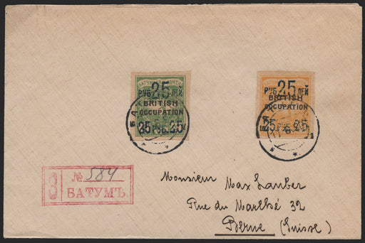 £475.00| /Batum British Occupation 1920 (17 June) registered "Lauber" cover to Switzerland, franked by 1920 (1 Apr) 25r on 5k yellow-green and 25r on 25k ora...
