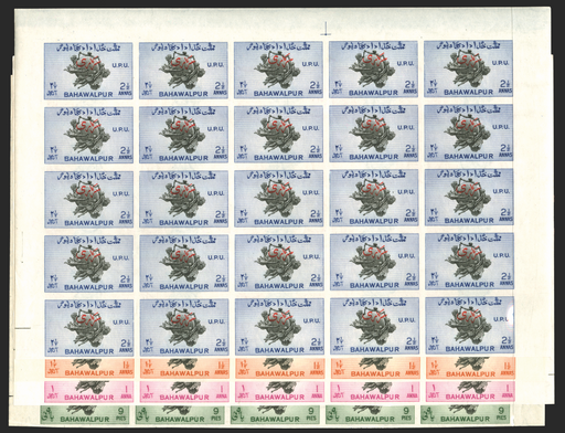 £750.00| /Pakistan Bahawalpur 1949 Anniversary of Universal Postal Union set of 4 to 2½a Officials, in complete IMPERFORATE sheets of 50 (5x10), each with pl...