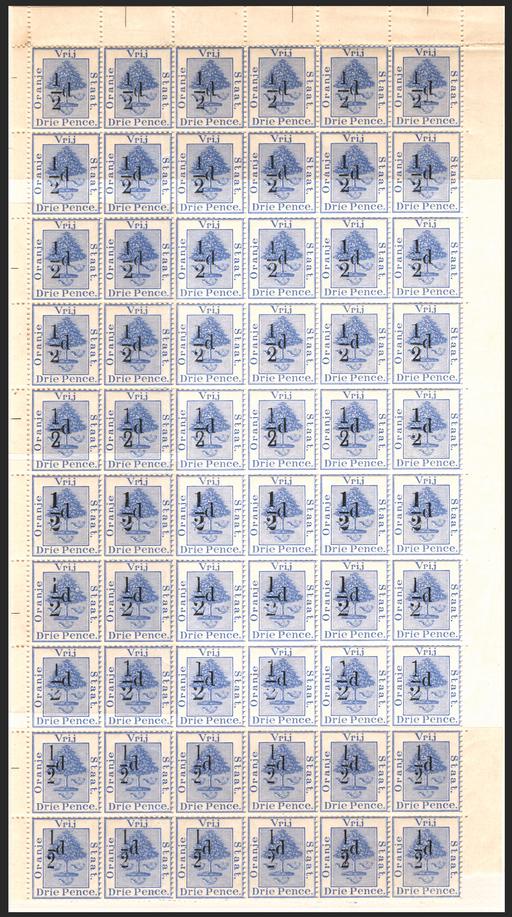 £375.00| /South Africa Orange Free State 1896 'Halve/Penny.' on 3d ultramarine, type 10 surcharge, complete folded upper half-sheet of 120 (two panes 6x10) s...