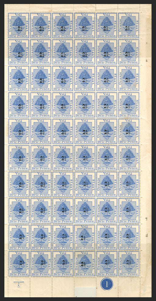 £395.00| /South Africa Orange Free State 1897 '2½' on 3d ultramarine, type 11 surcharge, nearly complete lower right pane of 60 (6x10) lacking one vertical p...