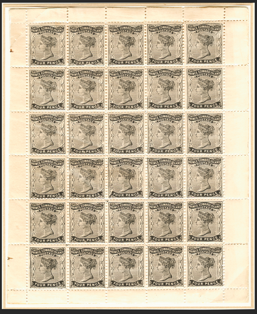 £895.00| /Prince Edward Island 1862-69 4d black on yellowish toned wove, perforations 11½-12, complete sheet of 30 (5x6), SG16. A very fine quality mint shee...