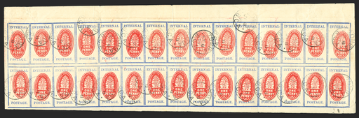 £3,750.00| /Nyasaland 1898 (11 Mar) 'Cheque stamp' 1d vermilion and (pale to deep) ultramarine, setting II, complete imperforate pane of 30 (15x2) showing the ...