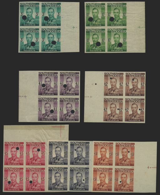 £750.00| /Southern Rhodesia 1937 King George VI large format Revenues 3s, 10s to £10, £50, seven values, each in a left (£1, £2) or right marginal (£5 upper ...