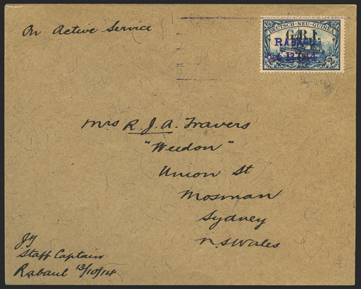 £7,500.00| /New Guinea 1914 (Oct 13) cover to Mrs. R. J. A. Travers, Sydney from her husband Capt Travers, endorsed "On Active Service", franked by 1914-15 New...