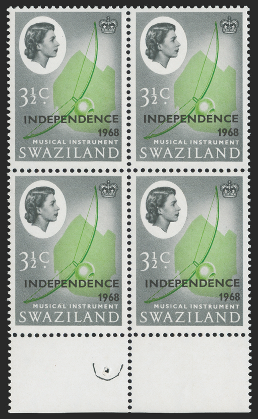 £425.00| /Swaziland 1968 Independence ½c black, brown and yellow-brown, type 42 overprint, error BROWN OMITTED, lower marginal with sheet marking proving pos...