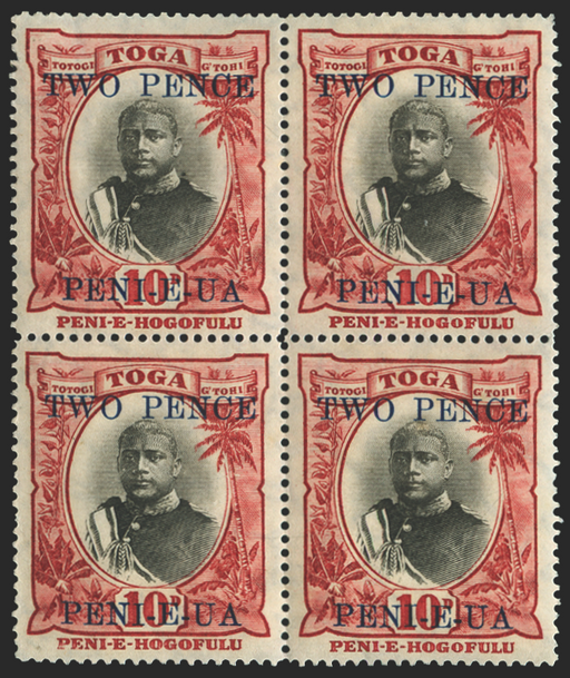 £250.00| /Tonga 1923-24 2d on 10d black and lake, type 27 surcharge in blue, watermark upright (inverted), block of 4, positions 6-7/16-17 on the sheet, show...