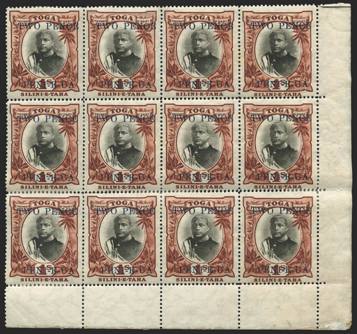 £550.00| /Tonga 1923-24 2d on 1s black and red-brown, type 27 surcharge in blue, watermark upright, lower right corner block of 12 (4x3 - the bottom row seve...