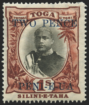 Tonga 1923-4 2d on 1s black and red-brown variety, SG67var