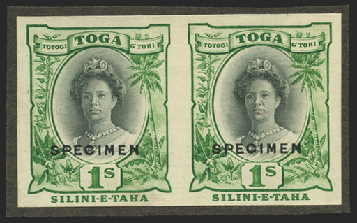 £250.00| /Tonga 1922(c.) printer's sample of 1920-35 1s "Queen Salote" in black and yellow-green on thick wove, overprinted "SPECIMEN" (type DS1), SG63. A ve...