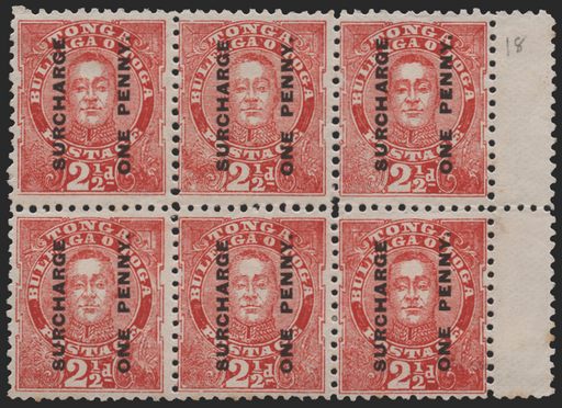 £375.00| /Tonga 1895 (20 June) 1d on 2½d vermilion (type 12a), block of 6 (3x2) from position 16-18/22-24 left pane with interpane margin at right, SG30. A f...