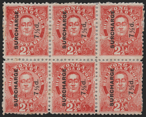 £150.00| /Tonga 1895 (20 June) 7½d on 2½d vermilion (type 12a), block of 6 (3x2) from position 13-15/19-21, SG31. A fine mint block with typical backing adhe...
