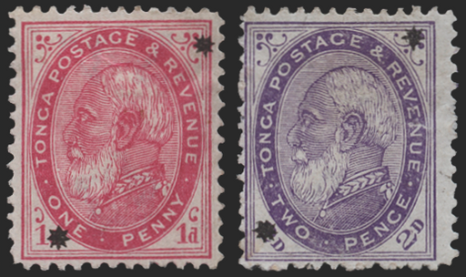 £80.00| /Tonga 1891 (23 Nov) 1d carmine and 2d violet, perforations 12½, "stars" overprint, SG7/8. Fine quality mint examples with part original gum. Minor ...