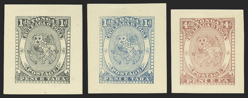 £325.00| /Tonga 1892 "Arms of Tonga", three die proofs in unissued colours comprising 1d black, 1d blue and 4d pale red-brown, each on yellowish wove (c. 24-...