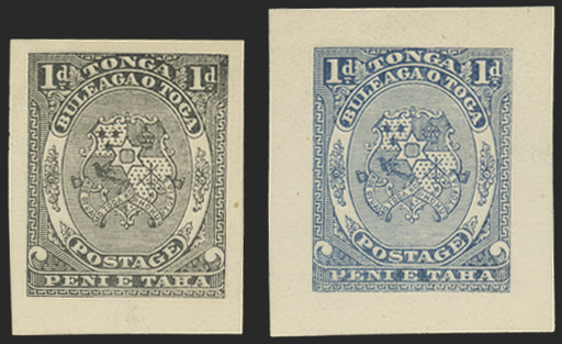 £175.00| /Tonga 1892 "Arms of Tonga" 1d, two die essay proofs (unadopted frame), respectively in black (21x26mm, tiny thin) and dark blue on yellowish wove (...