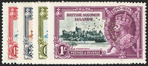 £130.00| /Solomon Islands 1935 Silver Jubilee set of 4 to 1s, perforated 'SPECIMEN' (type D19), SG53s/6s. Brilliant quality unmounted mint with full original...