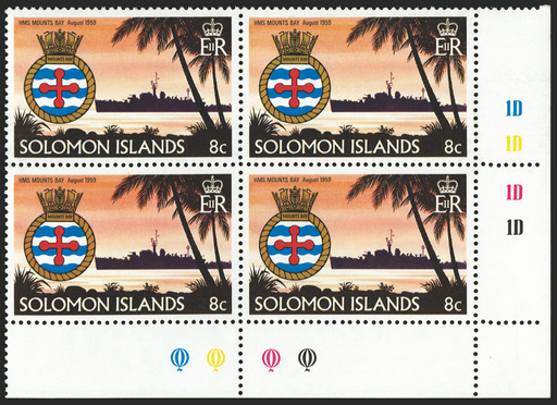 £55.00| /Solomon Islands 1981 Ships and crests 8c, variety watermark Crown to right of CA (from back), lower right corner block of 4 with '1D' (x4) plate nu...