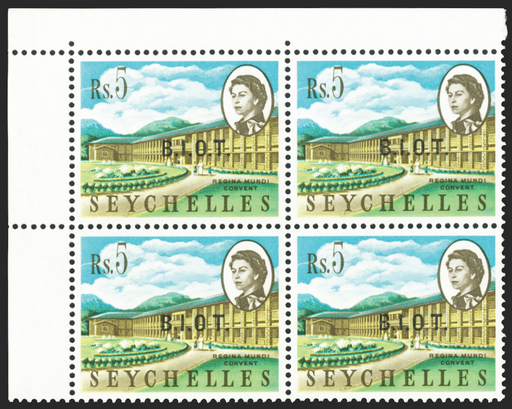 £75.00| /British Indian Ocean Territory 1968 5r multicoloured "Regina Mundi Convent", type 1 overprint, lower marginal block of 4, upper right stamp variety...