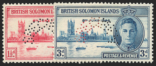 £95.00| /Solomon Islands 1946 Victory 1½d and 3d, perforated 'SPECIMEN' (type D21), SG73s/4s. Brilliant and fresh mint examples with original gum. The 3d st...