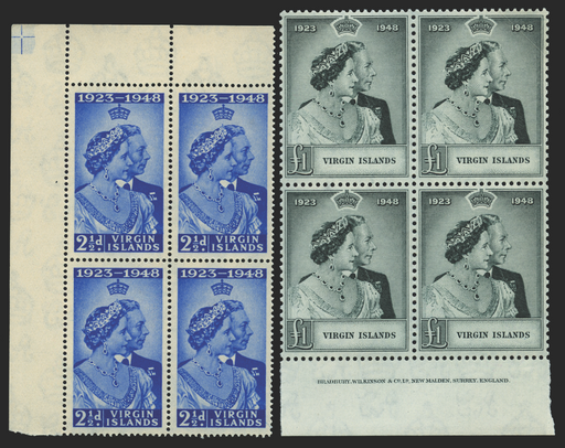 £80.00| /British Virgin Islands 1949 Royal Silver Wedding 2½d ultramarine and £1 black in blocks of 4, SG124/5. Fantastic quality blocks of four unmounted m...