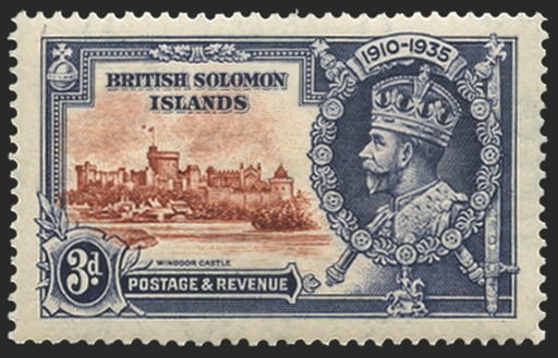 £250.00| /Solomon Islands 1935 Silver Jubilee 3d brown and deep blue, variety 'Dot by flagstaff' from vignette plate '4', R8/4, SG54h. Fine mint example of t...