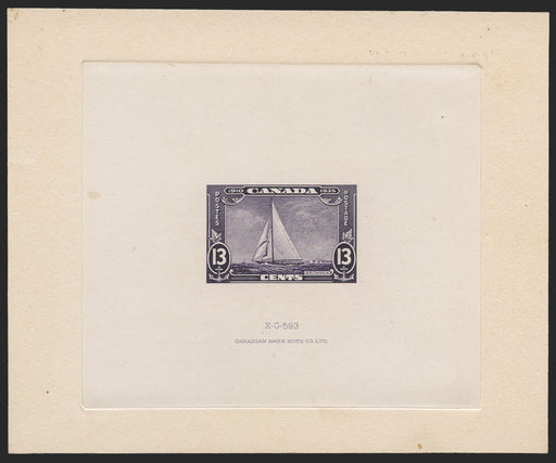 £850.00| /Canada 1935 Silver Jubilee 13c 'Royal Yacht Britannia' trial colour die proof in violet on India paper, die sunk on card (120 x 99mm), showing die ...