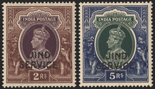 £80.00| /Indian Convention States Jind 1939-43 2r purple and brown and 5r green and blue ‘JIND SERVICE‘ Officials, SGO84/5. Very fine unmounted mint example...