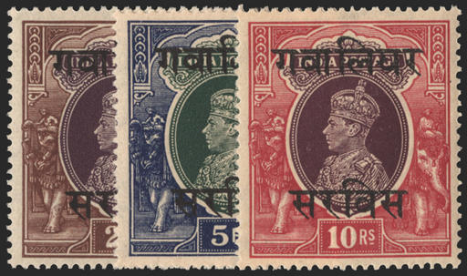 £150.00| /Indian Convention States Gwalior 1942-47 2r purple and brown, 5r green and blue, 10r purple and claret Officials, SGO92/4. Very fine unmounted mint...