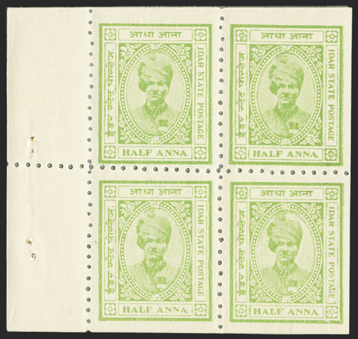 £125.00| /Indian Feudatory States Idar 1932-43 ½a (pale) yellow-green (thick paper), white panels, complete booklet pane of 4, SG1a. A fine and fresh mint po...