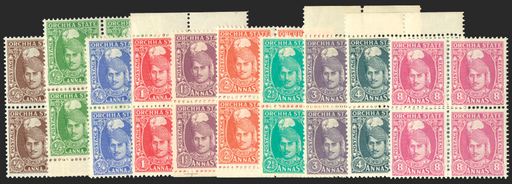 £325.00| /Indian Feudatory States Orchha 1939-42 set on 10 to 8a, (missing the 1¼a, SG35), in blocks of 4 (four being marginal examples), SG31/41. A fine and...